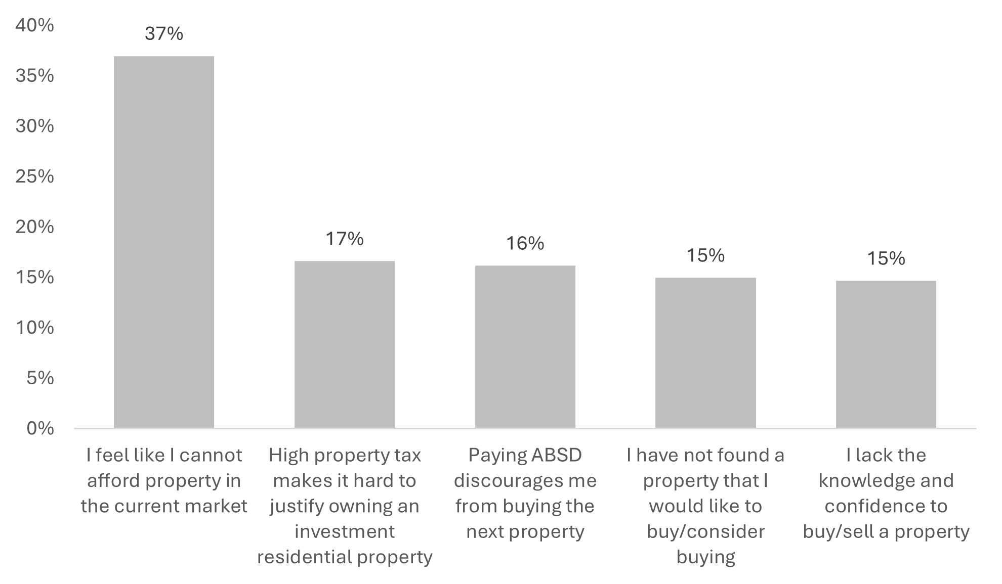 Affordability was a main concern expressed, with 37% of respondents stating that as their main challenge in buying a property in Singapore today. This is understandably the highest among all cohorts, as they are still studying or in early stages of their career and wealth accumulation. This finding helps explain why a larger share of Young Singaporeans (29%) expect to purchase a home only after five years, compared to 21% of all respondents, reflecting their current life stage and financial priorities.